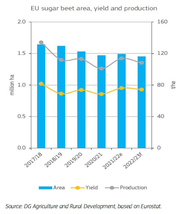 Η ΕΚ εκτιμά ότι η παραγωγή ζάχαρης στην ΕΕ των 27 θα μειωθεί κατά 5% το 2022/23 λόγω του πρόσφατου ξηρού και ζεστού καιρού. Ωστόσο, λόγω της αύξησης της παραγωγής το περασμένο έτος 2021/22, τα τελικά αποθέματα ζάχαρης της ΕΕ αναμένεται να ανακάμψουν σε 1,9 εκατομμύρια τόνους, περισσότερο από 50% υψηλότερα από τα πολύ χαμηλά τελικά αποθέματα πέρυσι των 1,2 εκατομμυρίων τόνων.