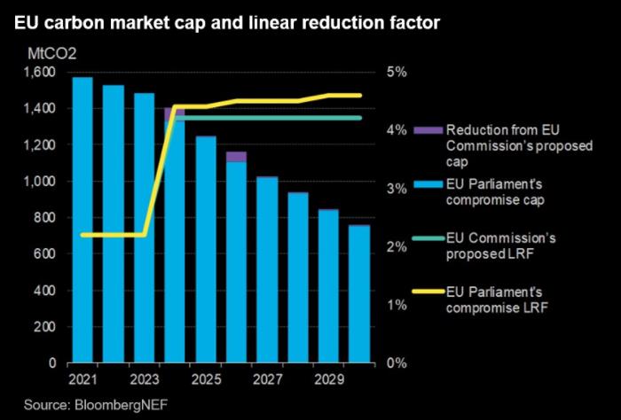 Ο νέος στόχος μείωσης των εκπομπών για τους τομείς που καλύπτονται από το ETS είναι μια μείωση κατά 63% έως το 2030 σε σχέση με τα επίπεδα του 2005, πιο φιλόδοξη από τη μείωση κατά 61% που προτείνει η Ευρωπαϊκή Επιτροπή. Εκτός από τις ταχύτερες περικοπές εκπομπών, η συνέλευση ψήφισε επίσης υπέρ της ταχύτερης σταδιακής κατάργησης των δωρεάν δικαιωμάτων και ορίων για τους χρηματοοικονομικούς κερδοσκόπους, μεταξύ άλλων.