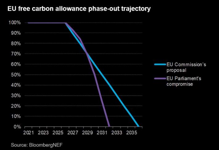 Οι νομοθέτες της ΕΕ υιοθέτησαν επίσης μια ταχύτερη σταδιακή κατάργηση των δωρεάν δικαιωμάτων, καθώς το μπλοκ εισάγει έναν μηχανισμό προσαρμογής συνόρων άνθρακα (CBAM) με στόχο να αποτρέψει τη λεγόμενη διαρροή άνθρακα. Το νέο χρονοδιάγραμμα είναι μια σταδιακή μείωση από το 2027 έως το 2032, αντί της πρότασης της Επιτροπής από το 2026 έως το 2036.