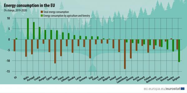 Σε ότι αφορά στην ενέργεια που καταναλώνεται από τον τομέα της γεωργίας και της δασοκομίας, υπήρξαν απότομοι ρυθμοί αύξησης σε ορισμένα κράτη μέλη μεταξύ 2019 και 2020, ιδίως για τη Μάλτα (+10%), την Πορτογαλία (+8%) και την Κροατία (+6%).