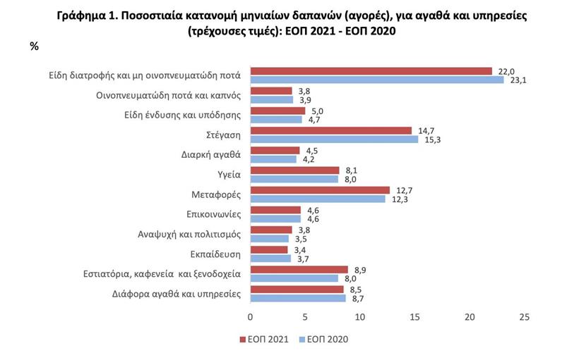 Η μεγαλύτερη θετική μεταβολή στην ποσοστιαία συμμετοχή των διαφόρων δαπανών σε σταθερές τιμές 2021, σε σχέση με την προηγούμενη έρευνα του έτους 2020, παρατηρείται στα εστιατόρια, καφενεία και ξενοδοχεία (1,1 ποσοστιαίες μονάδες), ενώ η μεγαλύτερη ποσοστιαία μείωση συμμετοχής στη στέγαση (-2,4 ποσοστιαίες μονάδες)