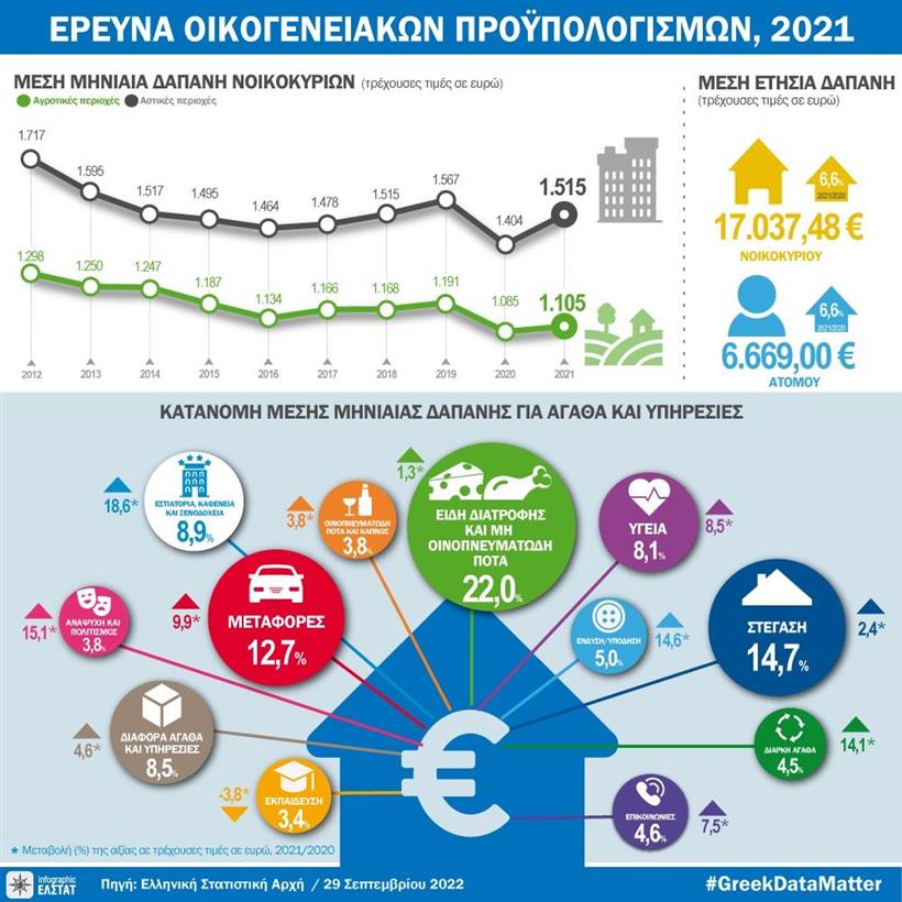 -Η μέση ετήσια δαπάνη των νοικοκυριών το 2021 εμφανίζεται μειωμένη κατά 33,0% σε σύγκριση με το 2008.