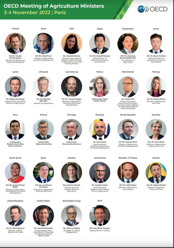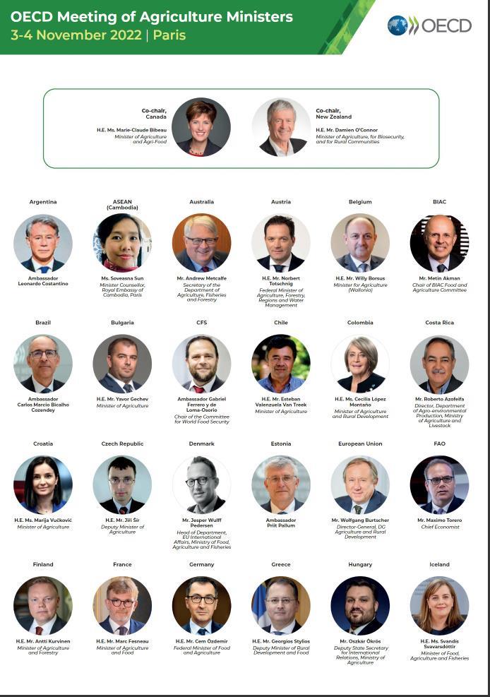 Περισσότεροι από 45 Υπουργοί Γεωργίας από χώρες μέλη και μη μέλη του ΟΟΣΑ θα συναντήθηκαν στο Παρίσι για να συμφωνήσουν σε συγκεκριμένες ενέργειες που θα συμβάλουν στην οικοδόμηση βιώσιμων συστημάτων γεωργίας και τροφίμων σε ένα μεταβαλλόμενο περιβάλλον: Κοινές προκλήσεις, μετασχηματιστικές λύσεις .