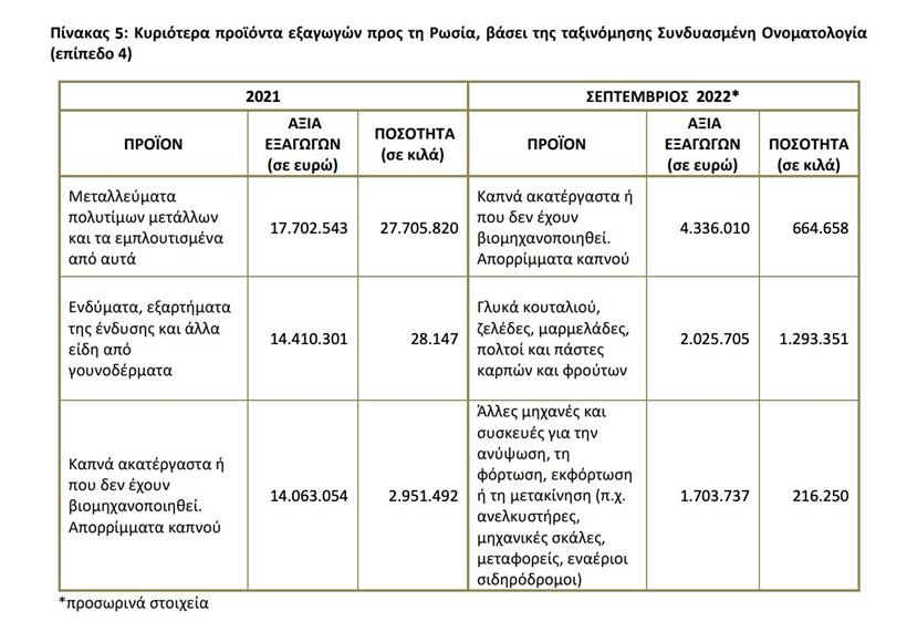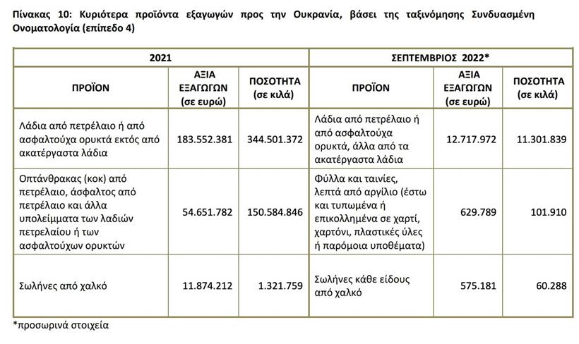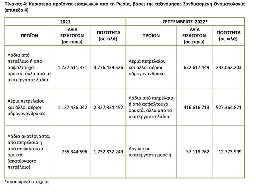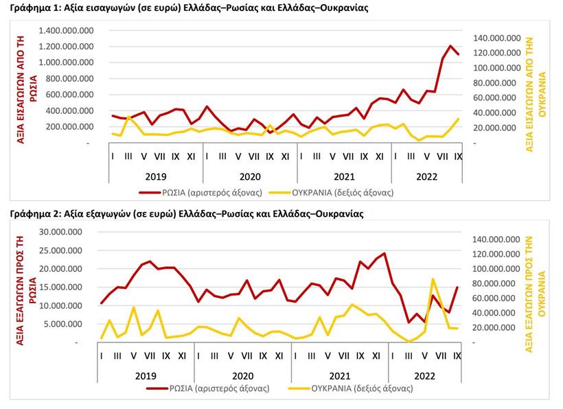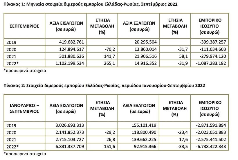 Παράλληλα, την περίοδο Ιανουαρίου-Σεπτεμβρίου 2022 η αξία των εισαγωγών της Ελλάδας από τη Ρωσία ανήλθε σε 6,831,3 δισ. ευρώ και σημείωσε αύξηση 151,6% σε σχέση με την περίοδο Ιανουαρίου-Σεπτεμβρίου 2021 που ήταν 2,715 δισ. ευρώ. Η αξία των εξαγωγών της Ελλάδας προς τη Ρωσία την περίοδο Ιανουαρίου-Σεπτεμβρίου 2022 ανήλθε σε 92,9 εκατ. ευρώ, καταγράφοντας μείωση 33,5% σε σχέση με την περίοδο Ιανουαρίου-Σεπτεμβρίου 2021 που ήταν 139,7 εκατ. ευρώ. Το εμπορικό ισοζύγιο Ελλάδας-Ρωσίας την περίοδο Ιανουαρίου-Σεπτεμβρίου 2022 ήταν αρνητικό και ανήλθε σε 6.738,4 εκατ. ευρώ (έλλειμμα).