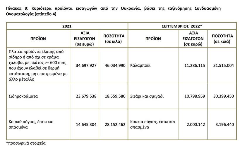 Τον Σεπτέμβριο 2022 η αξία των εισαγωγών της Ελλάδας από την Ουκρανία ανήλθε σε 31,6 εκατ. ευρώ, σημειώνοντας αύξηση 234,9% σε σχέση με τον Σεπτέμβριο 2021 που ήταν 9,4 εκατ. ευρώ. Η αξία των εξαγωγών της Ελλάδας προς την Ουκρανία τον Σεπτέμβριο 2022 ανήλθε σε 18,9 εκατ. ευρώ, σημειώνοντας μείωση 57,7% σε σχέση με τον Σεπτέμβριο 2021 που ήταν 44,7 εκατ. ευρώ. Το εμπορικό ισοζύγιο Ελλάδας-Ουκρανίας τον Σεπτέμβριο 2022 ήταν αρνητικό και ανήλθε σε 12,7 εκατ. ευρώ (έλλειμμα).