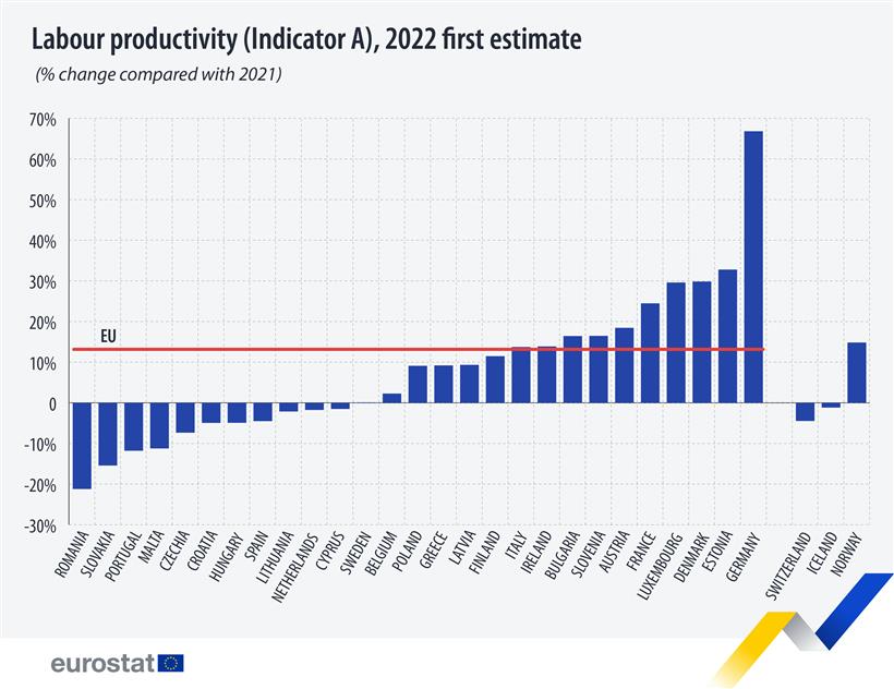 Ως αποτέλεσμα αυτών των κραδασμών, υπήρξε μια ακόμη ευρύτερη κατανομή των ρυθμών μεταβολής της παραγωγικότητας της αγροτικής εργασίας (όπως μετράται με τον δείκτη του πραγματικού εισοδήματος των παραγόντων στη γεωργία ανά ετήσια μονάδα εργασίας) το 2022 από ό,τι συνήθως. Ο πιο απότομος ρυθμός αύξησης της εκτιμώμενης παραγωγικότητας της γεωργικής εργασίας το 2022 ήταν στη Γερμανία (+66,8 %), όπου η μέση αύξηση της τιμής των προϊόντων παραγωγής (+29,5 %) ξεπέρασε εκείνη των εισροών (+14,0 %). Απότομες αυξήσεις σημειώθηκαν επίσης στην Εσθονία (+32,8 %), στη Δανία (+29,8 %) και στο Λουξεμβούργο (+29,6 %).