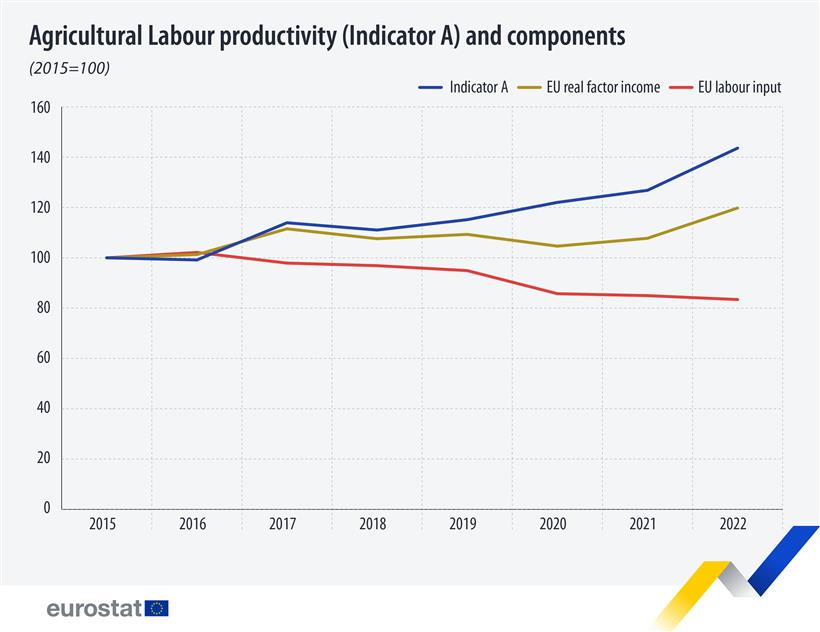 Σε σύγκριση με το 2015, ο δείκτης του πραγματικού εισοδήματος των συντελεστών παραγωγής της ΕΕ ήταν 19,8% υψηλότερος το 2022. Κατά την ίδια περίοδο, σημειώθηκε σταθερή και συνολική πτώση του δείκτη εισροής γεωργικής εργασίας κατά 16,6%. Μαζί, αυτές οι αλλαγές είχαν ως αποτέλεσμα η παραγωγικότητα της γεωργικής εργασίας στην ΕΕ (Δείκτης Α) να είναι 43,6% υψηλότερη το 2022 σε σχέση με το 2015.
