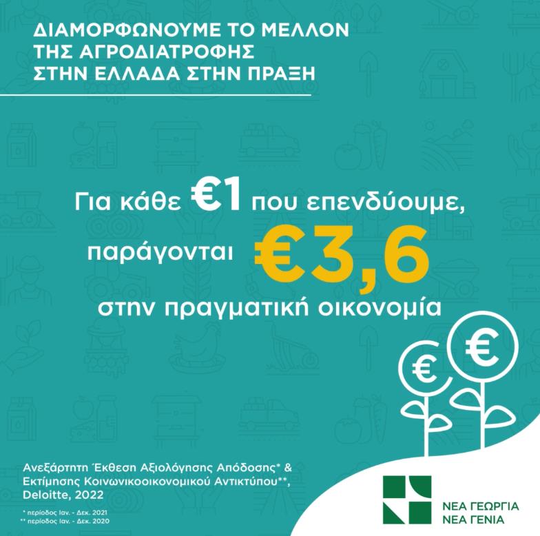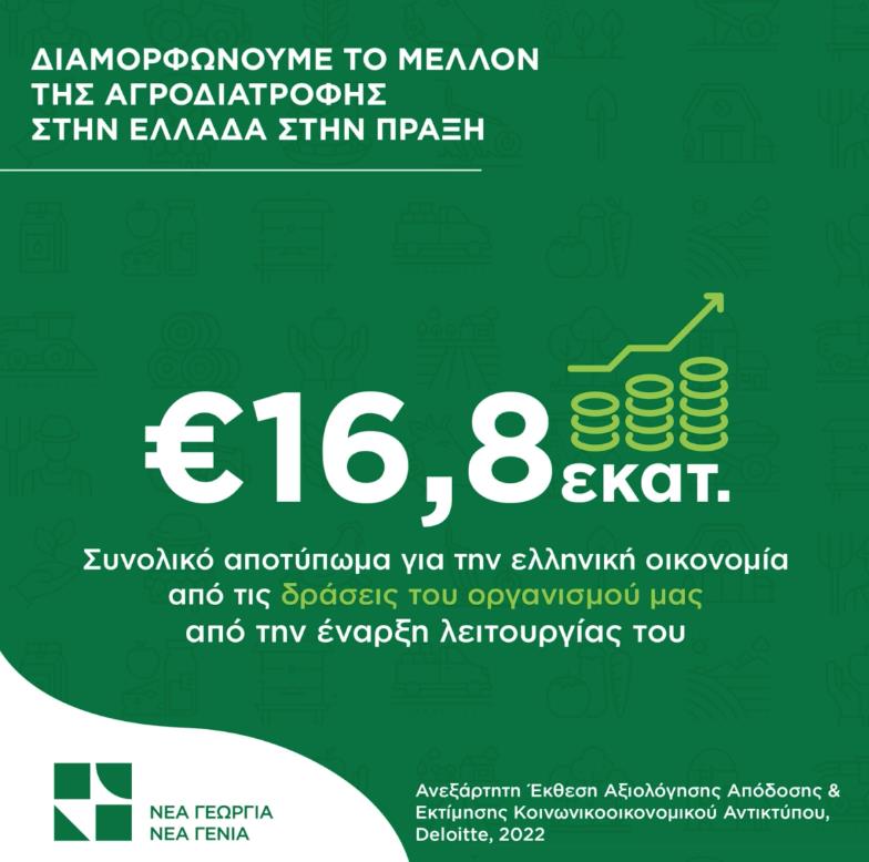Ο οργανισμός Νέα Γεωργία Νέα Γενιά, στα 4 χρόνια από την ίδρυσή του, έχει συμβάλει δραστικά στη διαμόρφωση ενός σύγχρονου τοπίου στον ελληνικόαγροδιατροφικό τομέα, σύμφωνα με στοιχεία που προκύπτουν από πρόσφατη μελέτη της εταιρείας Deloitte. Σχεδόν 30.000 άτομα έχουν επωφεληθεί από τα προγράμματά του οργανισμού, ενώ το συνολικό αποτύπωμα από τις δράσεις και των ωφελούμενων στην ελληνική οικονομία πλησιάζει τα 27 εκατ. ευρώ.