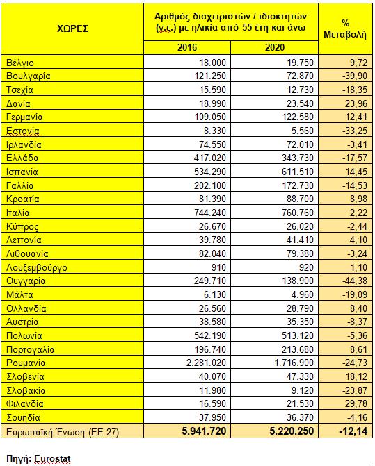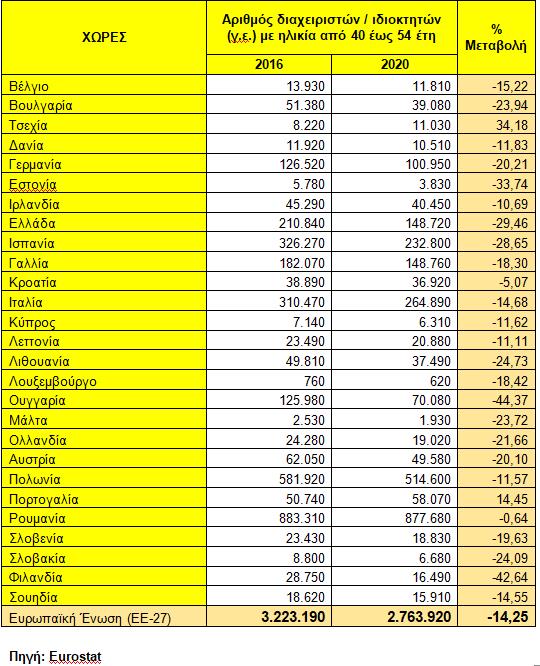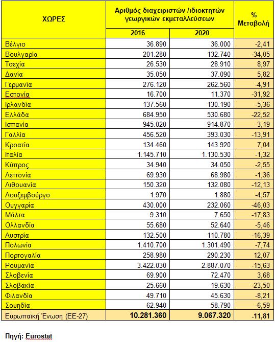 Στον πίνακα 1 βλέπουμε ότι ο συνολικός αριθμός των διαχειριστών/ιδιοκτητών γεωργικών εκμεταλλεύσεων στην Ευρωπαϊκή Ένωση (ΕΕ-27) μειώνεται από 10.281.360 το 2016 σε 9.067.320 το 2020, υπάρχει δηλαδή μείωση κατά 11,81%. Στην Ελλάδα ο αριθμός των διαχειριστών/ ιδιοκτητών γεωργικών εκμεταλλεύσεων από 684.950 το 2016 μειώνεται σε 530.680, δηλαδή η μείωση είναι διπλάσια κατά 22,52%.