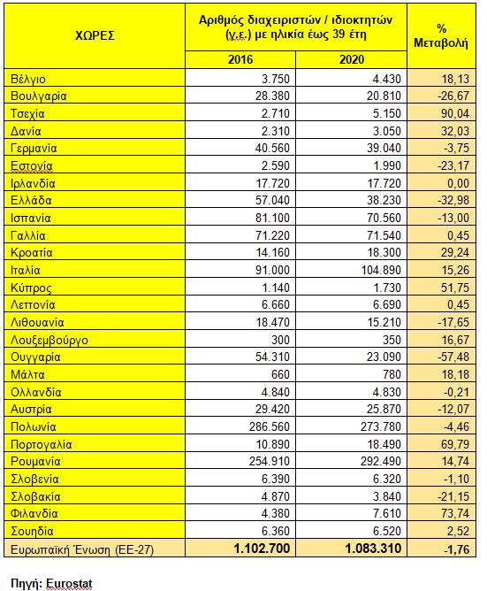 Στον πίνακα 2.1 βλέπουμε ότι ο αριθμός των νεότερης ηλικίας γεωργών διαχειριστών/ιδιοκτητών γεωργικών εκμεταλλεύσεων στην Ευρωπαϊκή Ένωση (ΕΕ-27) μειώνεται από 1.102.700 το 2016 σε 1.083.310 το 2020, δηλαδή υπάρχει μικρή μείωση κατά 1,76%. Στην Ελλάδα ο αντίστοιχος αριθμός των διαχειριστών/ ιδιοκτητών γεωργικών εκμεταλλεύσεων από 57.040 το 2016 μειώνεται σε 38.230 το 2020, με σημαντική μείωση κατά 32,98% .