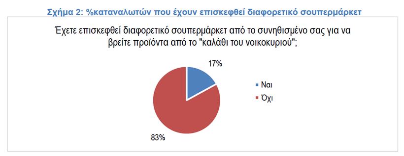 Όσον αφορά τις αγοραστικές τάσεις, όπως καταγράφεται στο σχήμα 2, 17% του κοινού επισκέφθηκε κάποιο κατάστημα σουπερμάρκετ διαφορετικό από το συνηθισμένο του προκειμένου να βρει προϊόντα από το καλάθι του νοικοκυριού. Το στοιχείο αυτό είναι υγιές για τον ανταγωνισμό στον κλάδο, δείχνει ότι υπάρχουν επιπλέον κίνητρα για τον ανταγωνισμό στην αγορά και ότι η κινητικότητα του καταναλωτικού κοινού το επόμενο διάστημα αναμένεται να ενταθεί.