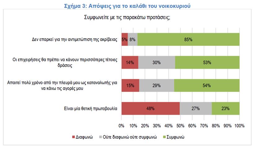 • Το 53% αναγνωρίζει τη χρησιμότητα των πρωτοβουλιών όπως το καλάθι του νοικοκυριού και δηλώνει ότι οι επιχειρήσεις θα πρέπει να κάνουν κι άλλες τέτοιες δράσεις.