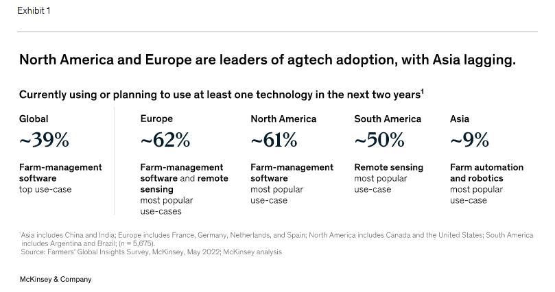 Οι ευρωπαίοι και οι βορειοαμερικανοί αγρότες ηγούνται της παγκόσμιας υιοθέτησης agtech, με περίπου το 61% να χρησιμοποιεί ή να σχεδιάζει να υιοθετήσει ένα προϊόν agtech τα επόμενα δύο χρόνια. Οι αγρότες της Βόρειας Αμερικής αναφέρουν το υψηλό κόστος (52 τοις εκατό) και το ασαφές ROI (40 τοις εκατό) ως τις μεγαλύτερες προκλήσεις τους για την υιοθέτηση συστημάτων διαχείρισης αγροκτημάτων. Οι αγρότες στην Ευρώπη, αν και ανησυχούν περισσότερο για το υψηλό κόστος (48%), αναφέρουν την πολυπλοκότητα στη ρύθμιση και τη χρήση ως πρόσθετο σημαντικό εμπόδιο στην υιοθέτηση (32%). Οι αγρότες στη Νότια Αμερική (50 τοις εκατό) ακολουθούν στην υιοθέτηση agtech, με διαφορές στην υιοθέτηση που παρατηρούνται μεταξύ των χωρών σε κάθε περιοχή. Οι αγρότες της Νότιας Αμερικής ανησυχούν περισσότερο για την εμπιστοσύνη στη διαδικασία αγοράς μέσω διαδικτυακών πλατφορμών (33 τοις εκατό). Η υιοθέτηση προϊόντων Agtech είναι η χαμηλότερη στην Ασία, με μόνο το 9% περίπου των αγροτών να χρησιμοποιεί ή να σχεδιάζει να χρησιμοποιήσει τουλάχιστον ένα προϊόν agtech. Η υιοθέτηση ποικίλλει μεταξύ των χωρών σε αυτήν την περιοχή.