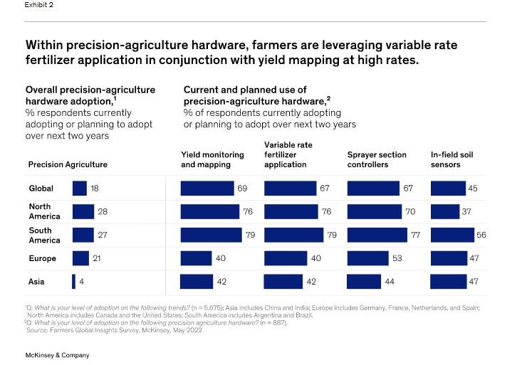 Η υιοθέτηση της Agtech δεν είναι ομοιόμορφη μεταξύ των περιοχών και, σε ορισμένες περιπτώσεις, υπάρχει ουσιαστική διαφοροποίηση μεταξύ χωρών εντός περιοχών—τόσο όσον αφορά το ποσοστό των αγροτών που χρησιμοποιούν agtech όσο και τις υποαγορές agtech που υιοθετούν. Το λογισμικό διαχείρισης αγροκτημάτων είναι η πιο κοινή υποαγορά μεταξύ των αγροτών της Βόρειας Αμερικής. Στη Νότια Αμερική, η τεχνολογία τηλεπισκόπησης είναι η υψηλότερη περίπτωση χρήσης (23%) και οι Βραζιλιάνοι αγρότες ξεπερνούν τους Αργεντινούς αγρότες σε υιοθέτηση στις περισσότερες υποαγορές agtech. Οι ευρωπαίοι αγρότες παρουσιάζουν σημαντική διαφοροποίηση ανά χώρα, καθώς και εντός των υποαγορών. Για παράδειγμα, η υιοθέτηση της αγοράς αγροτικών προϊόντων είναι η υψηλότερη στη Γερμανία με 13 τοις εκατό, ενώ η χρήση εξοπλισμού γεωργίας ακριβείας είναι η υψηλότερη στην Ολλανδία με 33 τοις εκατό. Στην Ασία, οι αγρότες στην Ινδία χρησιμοποιούν επί του παρόντος περισσότερα προϊόντα agtech από αυτά στην Κίνα σε όλες τις υποαγορές.