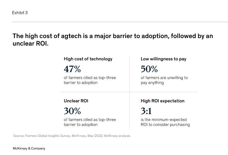 Μια σαφέστερη πρόταση αξίας που εστιάζει στην απόδοση επένδυσης θα ενθαρρύνει πιθανότατα περισσότερη υιοθέτηση - το 30 τοις εκατό των αγροτών ανέφεραν μια ασαφή απόδοση επένδυσης ως κορυφαίο εμπόδιο στην υιοθέτηση και, με βάση τις απαντήσεις τους, η ελάχιστη αναμενόμενη απόδοση επένδυσης που πρέπει να εξεταστεί η υιοθέτηση είναι 3:1. Αυτό υποδηλώνει ότι οι επιπτώσεις των τρεχουσών λύσεων δεν είναι εύκολα μετρήσιμες. Οι εταιρείες Agtech προσπαθούν επί του παρόντος να απομακρυνθούν από τις εφάπαξ αγορές και τις κατ' αποκοπήν ετήσιες ανανεώσεις λογισμικού ή λύσεων και να επικεντρωθούν περισσότερο στην προσαρμογή και την εξερεύνηση επιχειρηματικού μοντέλου. Επίσης, στρέφονται προς λύσεις δημιουργίας εσόδων με συνδυασμούς υλικού, λογισμικού, υπηρεσιών και αναλυτικών καινοτομιών για την ενίσχυση της οικονομικής βιωσιμότητας των επιχειρήσεών τους.