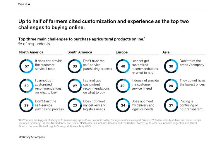 Τα ψηφιακά κανάλια μέσω των οποίων οι αγρότες μαθαίνουν και αποκτούν προϊόντα απαιτούν επίσης περαιτέρω προσοχή. Παρά το ενδιαφέρον των start-up και του κατεστημένου ενδιαφέροντος για διαδικτυακές πλατφόρμες, τα αποτελέσματα της έρευνας δείχνουν ότι λιγότερο από το 12 τοις εκατό των αγροτών παγκοσμίως προτιμούν έντονα να αγοράζουν προϊόντα μέσω Διαδικτύου. Όταν ρωτήθηκαν για το τι τους κάνει να διστάζουν να ψωνίσουν στο διαδίκτυο, οι αγρότες υποδεικνύουν ότι οι ηλεκτρονικές βιτρίνες δεν παρέχουν ικανοποιητική εμπειρία πελάτη ή δεν προσφέρουν εξατομικευμένες συστάσεις (Σχήμα 4). Αυτό είναι πιο σημαντικό σε ορισμένες κατηγορίες προϊόντων από άλλες—για παράδειγμα, η αξιολόγηση νέων ποικιλιών σπόρων απαιτεί περισσότερο διάλογο με τους ειδικούς πωλήσεων, σε σύγκριση με τη συνήθη αγορά ανταλλακτικών εξοπλισμού.