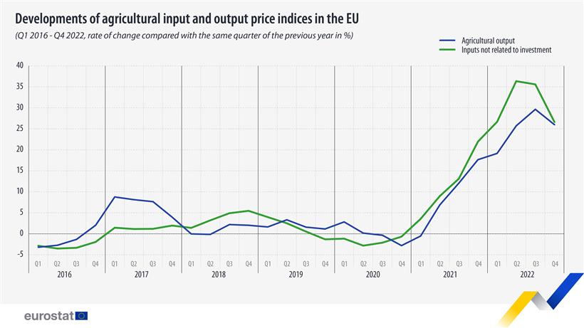 Μεταξύ του τέταρτου τριμήνου του 2021 (4 τρίμηνο 2021) και του τέταρτου τριμήνου του 2022 (4ο τρίμηνο 2022), η μέση τιμή της ΕΕ των γεωργικών προϊόντων στο σύνολό της (παραγωγή) αυξήθηκε σημαντικά (+26%) για το ίδιο «καλάθι» προϊόντων. Ωστόσο, αυτό αντιπροσώπευε χαμηλότερο ρυθμό αύξησης σε σύγκριση με το ρυθμό μεταβολής του προηγούμενου τριμήνου (+30% μεταξύ τρίτου τριμήνου 2021 και τρίτου τριμήνου 2022). Ιδιαίτερα έντονες αυξήσεις σημειώθηκαν για τα αυγά (+64%), τους χοίρους (+52%) και τις ελιές (+51%).