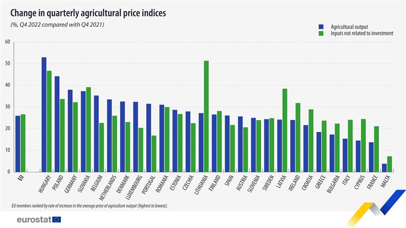 Οι πιο απότομοι ρυθμοί αύξησης της μέσης τιμής της γεωργικής παραγωγής κατά τη διάρκεια αυτής της περιόδου παρατηρήθηκαν στην Ουγγαρία (+53%), στην Πολωνία (+44%) και στη Γερμανία (+38%). Τα χαμηλότερα ποσοστά αύξησης σημειώθηκαν για τη Μάλτα (+4%), τη Γαλλία (+14%), την Κύπρο και την Ιταλία (και οι δύο +15%).