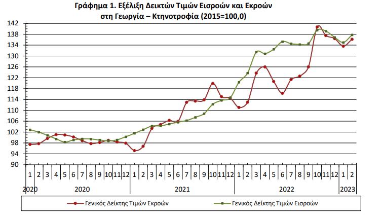 Σύμφωνα με τα στοιχεία της ΕΛΣΤΑΤ, η ετήσια αυτή αύξηση τον Φεβρουάριο του 2023, οφείλεται, πρώτον στην άνοδο κατά 12,5% του δείκτη τιμών της φυτικής παραγωγής και κυρίως στη μεταβολή της ομάδας ελαιόλαδο, και δεύτερον στην άνοδο κατά 29,5% του δείκτη τιμών της ζωικής παραγωγής.