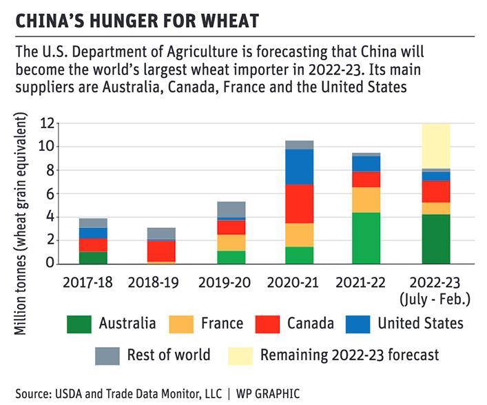 Η Αυστραλία ήταν ο κύριος προμηθευτής σιταριού στην Κίνα, ακολουθούμενη από τον Καναδά και μετά τη Γαλλία.
