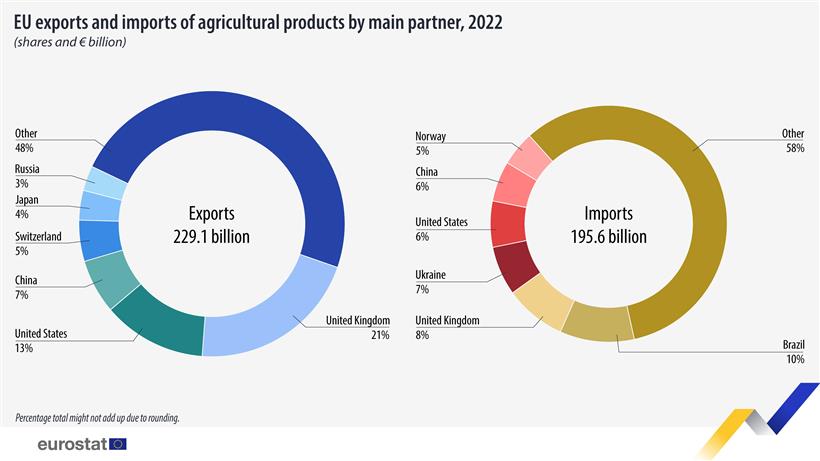Οι εισαγωγές εκτός ΕΕ προέρχονταν κυρίως από τη Βραζιλία (10%· 19,9 δισεκατομμύρια €), το Ηνωμένο Βασίλειο (8%· 16,4 δισεκατομμύρια €), την Ουκρανία (7%· 13,1 δισεκατομμύρια €), τις Ηνωμένες Πολιτείες (6%· 12,3 δισεκατομμύρια €) , Κίνα (σχεδόν 6%· 10,8 δισ. €) και Νορβηγία (5%· 9,3 δισ. €).