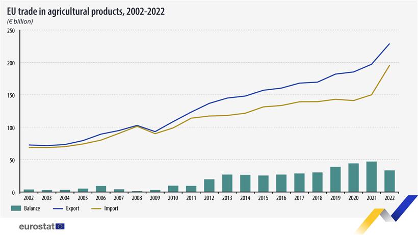 Μεταξύ 2002 και 2022, το εμπόριο γεωργικών προϊόντων της ΕΕ σχεδόν τριπλασιάστηκε (από 141,5 δισεκατομμύρια ευρώ σε 424,7 δισεκατομμύρια ευρώ), που ισοδυναμεί με μέση ετήσια αύξηση σχεδόν 5,6%. Την περίοδο αυτή, οι εξαγωγές αυξήθηκαν ταχύτερα (5,9%) από τις εισαγωγές (5,4%).