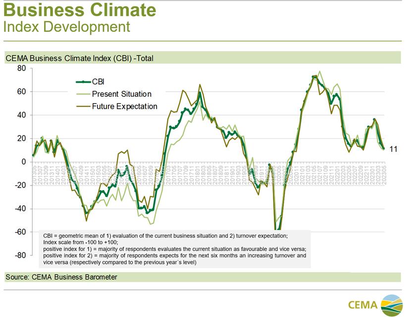 O γενικός δείκτης επιχειρηματικού κλίματος για τη βιομηχανία γεωργικών μηχανημάτων στην Ευρώπη έχει "εγκαταλείψει" πλήρως την ανοδική του πορεία μετά τις απότομες μειώσεις κατά τη διάρκεια του ρωσικού πολέμου κατά της Ουκρανίας και εξακολουθεί να βρίσκεται μόλις και μετά βίας σε θετικό επίπεδο. Τον Μάιο, ο δείκτης μειώθηκε από 16 σε 11 μονάδες (σε κλίμακα από -100 έως +100).