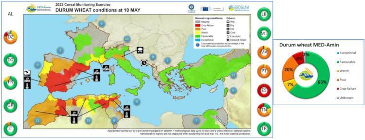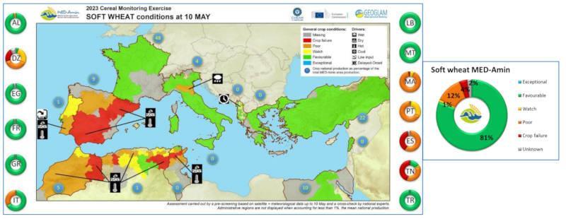 Το μαλακό σιτάρι έχει ευνοϊκές επιδόσεις στη Γαλλία και την Τουρκία, δυο χώρες που αποτελούν κύριους παραγωγούς μαλακού σιταριού στην περιοχή της Μεσογείου (αντιπροσωπεύουν το 48% και το 22% της παραγωγής αντίστοιχα). Στο Μαρόκο οι προοπτικές είναι αρνητικές λόγω της επίπονης εργασίας, ενώ στην Ιταλία το ένα τρίτο της παραγωγής είναι σε κακή κατάσταση λόγω των πλημμυρών που έπληξαν την περιοχή Εμίλια-Ρομάνια
