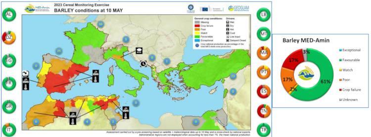 Από την άλλη πλευρά, το κριθάρι είναι πιο επηρεασμένη χειμερινή καλλιέργεια αυτής της περιόδου στην περιοχή της Μεσογείου. Το 34% της φυτεμένες έκτασης είναι σε κακή κατάσταση. Στην Ισπανία, η οποία αντιπροσωπεύει το 25% της παραγωγής του κριθαριού στην περιοχή της Μεσογείου, το μεγαλύτερο μέρος της χώρας πλήττεται από ξηρασία.