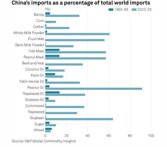 Παρακάτω είναι ένα διάγραμμα της αναλογίας των παγκόσμιων εισαγωγών της Κίνας κατά το καλλιεργητικό έτος 1992-93 για 20 περισσότερο ή λιγότερο τυχαία επιλεγμένα γεωργικά προϊόντα σε σύγκριση με την περίοδο 2022-23. Η Κίνα σπάνια αντιστοιχούσε σε περισσότερο από το 10% του παγκόσμιου εμπορίου πριν από 30 χρόνια και τώρα είναι ο μεγαλύτερος εισαγωγέας σε 12 από τα 20 εμπορεύματα.