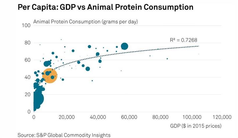 Υπάρχουν περίπου 180 κουκκίδες σε αυτό το γράφημα, με κάθε κουκκίδα να αντιπροσωπεύει μια χώρα και τη μεγάλη χρυσή κουκκίδα που αντιπροσωπεύει την Κίνα. Όσο μεγαλύτερη είναι η κουκκίδα, τόσο μεγαλύτερος είναι ο πληθυσμός. Καθώς μια χώρα κινείται από αριστερά προς τα δεξιά στον άξονα, ο πληθυσμός της καταναλώνει αμέσως περισσότερη ζωική πρωτεΐνη σε κατά κεφαλήν βάση. Καθώς η ανάπτυξη συνεχίζεται, η αύξηση της κατανάλωσης ζωικών πρωτεϊνών συνεχίζεται, αλλά με διαρκώς βραδύτερο ρυθμό, καθώς οι δαπάνες των νοικοκυριών επικεντρώνονται σε άλλα πράγματα.