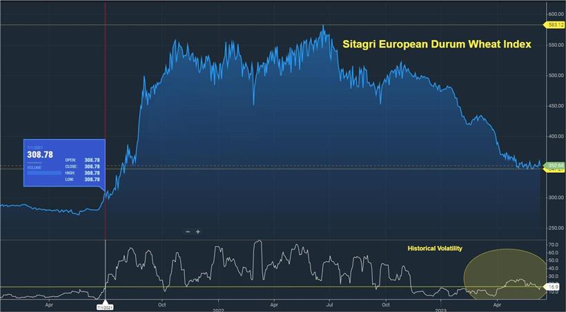 Η μεταβλητότητα του ευρωπαϊκού δείκτη σκληρού σίτου έχει υποχωρήσει στο επίπεδο των 15-16 σημείων επιστρέφοντας κοντά στα επίπεδα του 20-21 καλλιεργητικού έτους, όπως και οι τιμές.