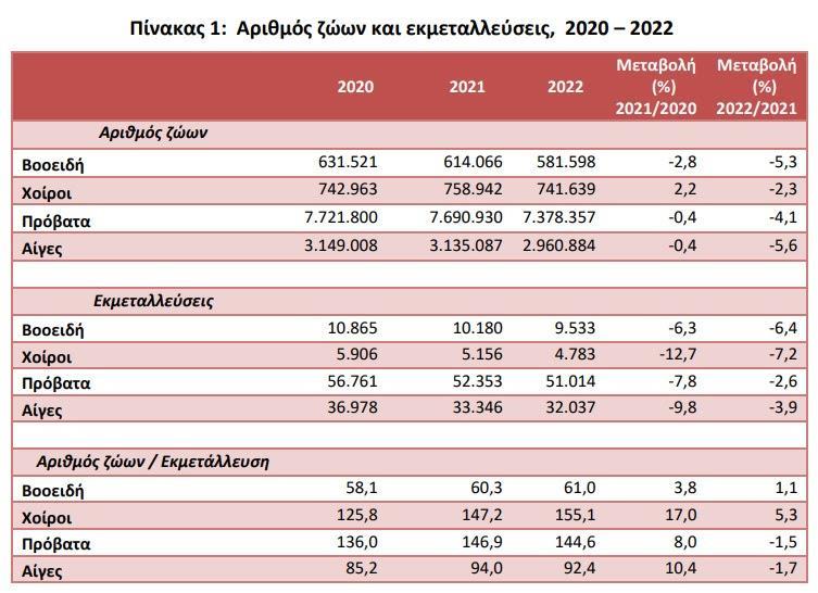 Σύμφωνα με τα αποτελέσματα των ερευνών ζωικού κεφαλαίου, κατά το χρονικό διάστημα 2020 – 2021 – 2022, παρατηρούνται οι ακόλουθες μεταβολές ως προς τον αριθμό των ζώων και των εκμεταλλεύσεων:
