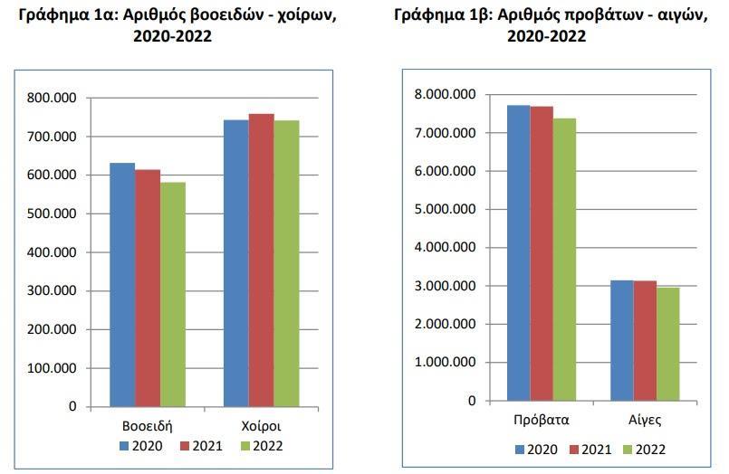 Σύμφωνα με Ο αριθμός των βοοειδών μειώθηκε κατά 5,3% το 2022 σε σχέση με το 2021 και κατά 2,8% το 2021 σε σχέση με το 2020. Συγκεκριμένα, ο αριθμός των βοοειδών ανήλθε σε 581.598 ζώα το 2022 έναντι 614.066 ζώων το 2021 και 631.521 ζώων το 2020 (Πίνακας 1, Γράφημα 1α).