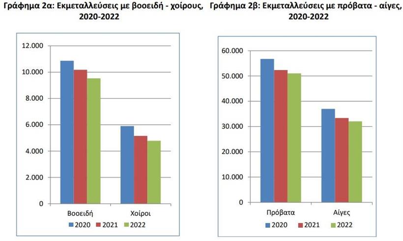 Συγκεκριμένα, ο αριθμός των εκμεταλλεύσεων που εκτρέφουν βοοειδή ανήλθε σε 9.533 εκμεταλλεύσεις το 2022, έναντι 10.180 εκμεταλλεύσεων το 2021 και 10.865 εκμεταλλεύσεων το 2020 (Πίνακας 1, Γράφημα 2α).