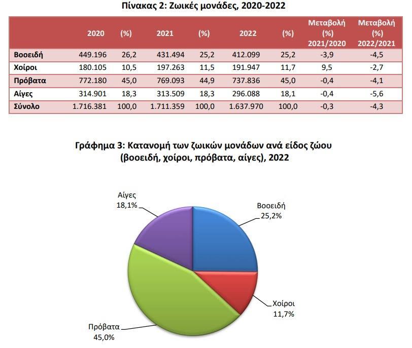 Το σύνολο του ζωικού κεφαλαίου (βοοειδή, χοίροι, πρόβατα, αίγες) εκφρασμένο σε ζωικές μονάδες (ΖΜ)2 παρουσίασε μείωση 4,3% το 2022 σε σχέση με το 2021 και 0,3% το 2021 σε σχέση με το 2020. Συγκεκριμένα για το έτος 2022 το σύνολο των ΖΜ ήταν 1.637.970, οι οποίες κατανέμονται ως εξής: 412.099 ΖΜ αντιστοιχούν στα βοοειδή, 191.947 ΖΜ στους χοίρους, 737.836 ΖΜ στα πρόβατα και 296.088 ΖΜ στις αίγες (Πίνακας 2, Γράφημα 3).
