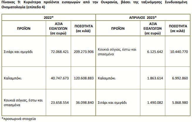 Ωστόσο, το σημείο που προκαλεί εντύπωση αφορά τις εισαγωγές από την Ουκρανία. Σύμφωνα με τα δεδομένα της Ελληνικής Στατιστικής Υπηρεσίας, τον Απρίλιο 2023 η αξία των εισαγωγών της Ελλάδας από την Ουκρανία ανήλθε σε 15,8 εκατ. ευρώ, σημειώνοντας αύξηση 402,7% σε σχέση με τον Απρίλιο 2022 που ήταν 3,2 εκατ. ευρώ. Ωστόσο, παρά τη γενική αύξηση των εισαγωγών, υπήρξε σημαντική διαφοροποίηση στα εισαγόμενα από την Ουκρανία είδη και ιδίως ως προς το ουκρανικό σιτάρι που, επιπλέον, έχει προκαλέσει τριβές σε ευρωπαϊκό επίπεδο, καθώς έχει πλημμυρίσει τις αγορές γειτονικών κρατών προς την Ουκρανία, αυξάνοντας την πίεση εις βάρος των τοπικών παραγωγών.
