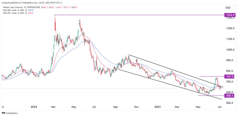Το ημερήσιο διάγραμμα δείχνει ότι οι τιμές του σιταριού ακολουθούν πτωτική τάση τους τελευταίους μήνες. Κορυφώθηκε στα 1.324 δολάρια το 2022 και έπεσε στο χαμηλό των 568 δολαρίων τον Ιούνιο και ανέκαμψε στα 768 δολάρια.