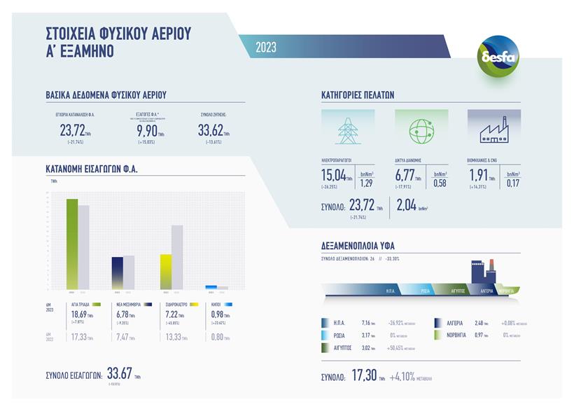 Σύμφωνα με τα στοιχεία του ΔΕΣΦΑ, κατά το πρώτο εξάμηνο του 2023, η εγχώρια κατανάλωση φυσικού αερίου μειώθηκε κατά 21,74%,αγγίζοντας τις 23,72 Τεραβατώρες (TWh), από 30,31TWh στην αντίστοιχη περσινή περίοδο. Oιεξαγωγές ανήλθαν σε περίπου 9,9 ΤWh, καταγράφοντας αύξηση κατά 15,03% σε σχέση με πέρσι.
