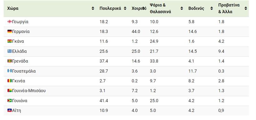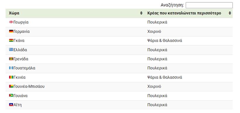 Ρίχνοντας μια ματιά στον χάρτη και στον παρακάτω πίνακα, τα πουλερικά ξεχωρίζουν ως η πιο δημοφιλής κατανάλωση κρέατος κατά βάρος σε 70 χώρες, ή περίπου το 40% της συνολικής βάσης δεδομένων. Στη χώρα μας όπως φαινεται και στην παρακάτω φωτογραφία το κρέας που καταναλώνεται περισσότερο είναι το κοτόπουλο.