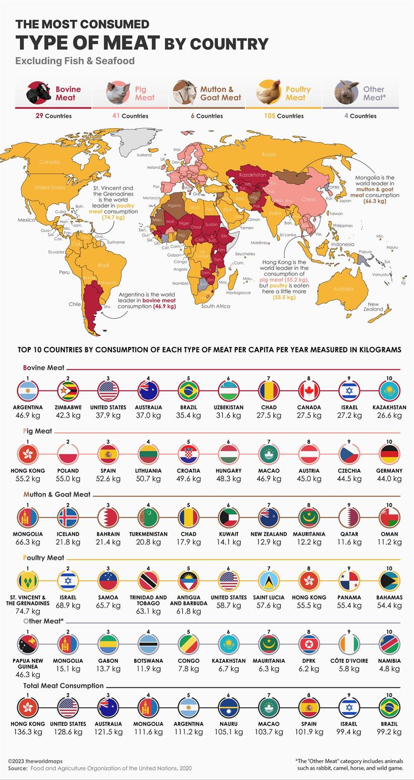 Πώς διαφέρουν οι χώρες ως προς την ποσότητα και το είδος του κρέατος που τρώνε; Σε αυτό το πολύχρωμο γραφικό, ο δημιουργός μας theWORLDMAPS επισημαίνει τον τύπο κρέατος που καταναλώνεται περισσότερο σε κάθε χώρα του κόσμου, χρησιμοποιώντας δεδομένα από τον Οργανισμό Τροφίμων και Γεωργίας του ΟΗΕ (FAO).