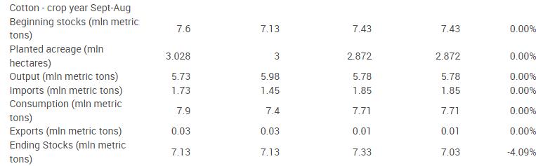 Οι εισαγωγές βαμβακιού αναμένεται να ανέλθουν σε 1,45 εκατ. μετρικούς τόνους, ανέφερε το υπουργείο στις μηνιαίες εκτιμήσεις του για την προσφορά και τη ζήτηση στην Κίνα (China Agricultural Supply and Demand Estimates - CASDE), μια μείωση 400.000 τόνων από την πρόβλεψη του περασμένου μήνα.