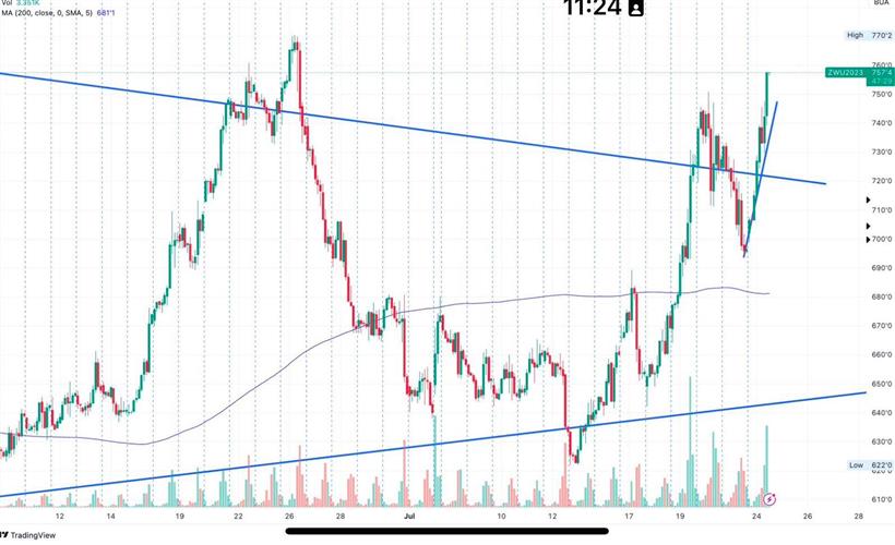 Οι τιμές αυξήθηκαν την περασμένη εβδομάδα μετά την αποχώρηση της Ρωσίας από την υπό τον ΟΗΕ συμφωνία για την εξαγωγή ουκρανικών σιτηρών μέσω της Μαύρης Θάλασσας. Τη Δευτέρα, επίθεση ρωσικού drone κατέστρεψε ένα σιλό αποθήκευσης σιτηρών στο ουκρανικό λιμάνι Ρένι.