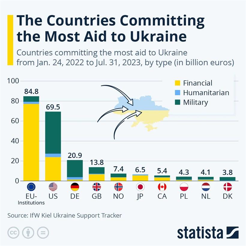 Ο μεγαλύτερος εταίρος στρατιωτικής βοήθειας της Ουκρανίας από την έναρξη του πολέμου, οι Ηνωμένες Πολιτείες, έχουν δεσμεύσει συνολικά 69,5 δισεκατομμύρια ευρώ σε βοήθεια, ενώ παράλληλα εξετάζουν οικονομική και ανθρωπιστική στήριξη. Η Γερμανία, το Ηνωμένο Βασίλειο και η Νορβηγία έπονται, προσφέροντας αναλογικά μεγάλη στήριξη.