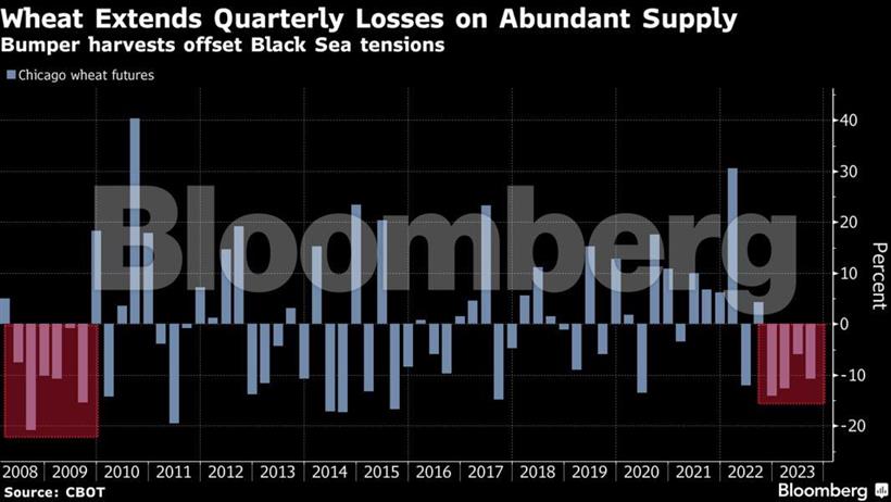 Προς τη μεγαλύτερη τριμηνιαία πτώση των τελευταίων 14 ετών οδεύει η ιμή του σιταριού, καθώς οι εξαιρετικές σοδειές σε ορισμένα μέρη του βόρειου ημισφαιρίου αντισταθμίζουν τη συνεχιζόμενη ένταση στη Μαύρη Θάλασσα μετά την «κατάρρευση» της συμφωνίας για τα σιτηρά.