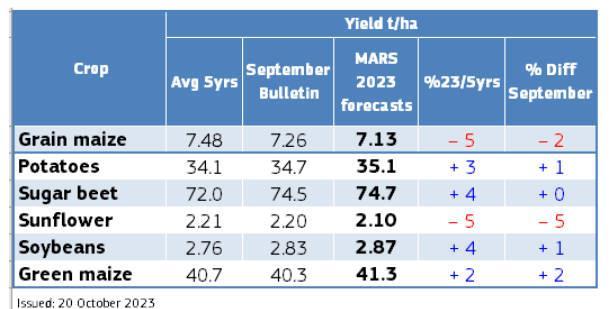 Σύμφωνα με εκτιμήσεις οι αποδόσεις για το καλαμπόκι θα φτάσουν τα 7.130 κιλά/εκτάριο, η οποία είναι 5% χαμηλότερα από το μέσο όρο των τελευταίων πέντε ετών και 2.100 κιλά/ εκτάριο για τον ηλίανθο, 5% χαμηλότερα από το μέσο όρο των τελευταίων πέντε ετών.