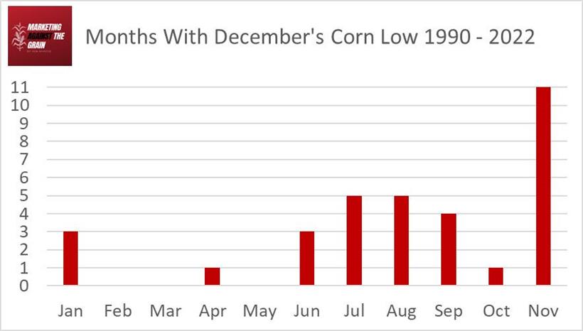 Σε οκτώ από τα τελευταία 16 έτη, το καλαμπόκι του Δεκεμβρίου σημείωσε χαμηλό για το ημερολογιακό έτος μετά την 1η Σεπτεμβρίου. Τα μισά από αυτά τα χαμηλά σημειώθηκαν τον Σεπτέμβριο και τα άλλα μισά τον Νοέμβριο, όπως φαίνεται σε αυτό το διάγραμμα: