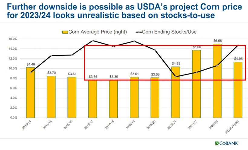 Ένας άλλος παράγοντας που κάνει τους οικονομολόγους να προβλέπουν χαμηλότερες τιμές καλαμποκιού είναι η σύγκριση των αποθεμάτων προς χρήση και της μέσης τιμής του καλαμποκιού.