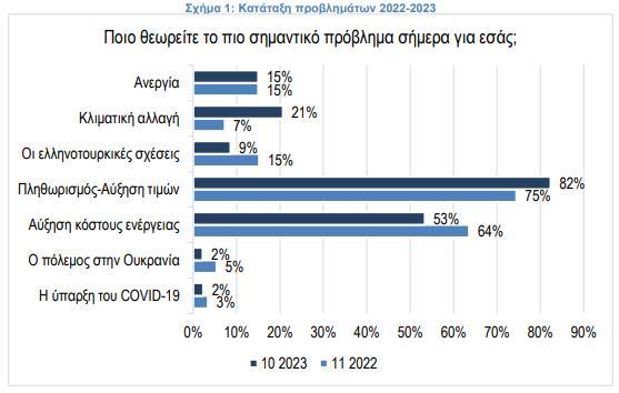 Όπως καταγράφεται στο σχήμα 1, η κλιματική αλλαγή έχει αναδειχθεί στο τρίτο τη τάξει πρόβλημα για τους καταναλωτές με ποσοστό 21%, πίσω από τον πληθωρισμό 82% και το κόστος ενέργειας με 53%.