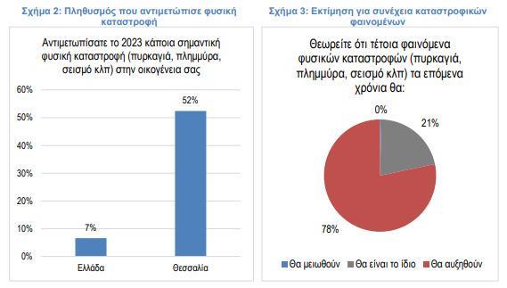 Όπως φαίνεται στο σχήμα 2, το 7% του πληθυσμού δηλώνει ότι αντιμετώπισε κάποια φυσική καταστροφή το 2023, δηλαδή περίπου 1 στους 13 πολίτες, ενώ το ποσοστό αυτό ανεβαίνει στο 52% στην περιοχή της Θεσσαλία, όπου φαίνεται ότι πάνω από το μισό του πληθυσμού ήρθε αντιμέτωπο με ακραία κλιματικά φαινόμενα.